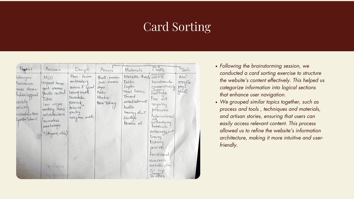 Card Sorting: A critical exercise used to categorize different Zardozi techniques, materials, and histories into intuitive groups for better information findability.